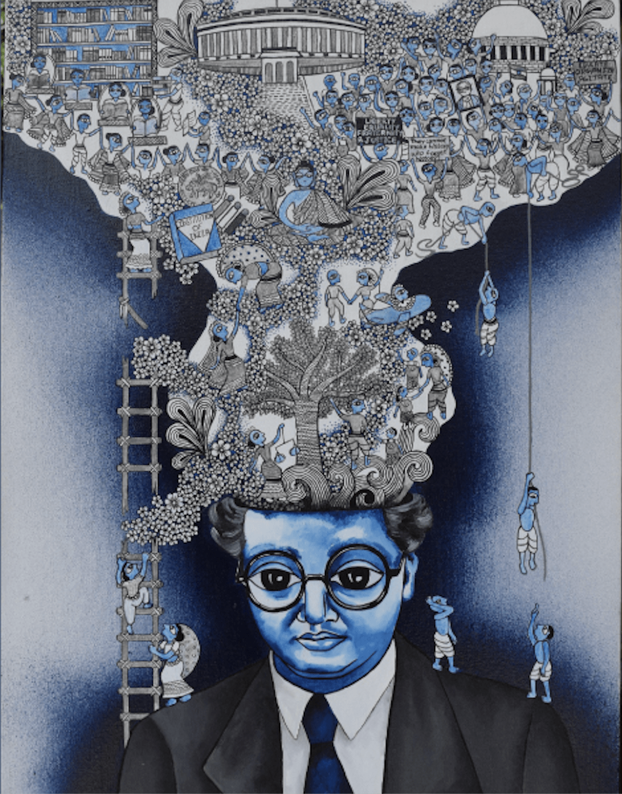 In Malavika Raj‘s Madhubani-style art piece, the foresightedness of Dr. Ambedkar’s comes alive – a vivid and rich reflection of India’s past, present and future. The display of his gifting of vision on cultivation of mind, on human progress, knowledge, and morality of Buddhism offered through constitutional and parliamentary democracy easily makes it one of our favourites.
